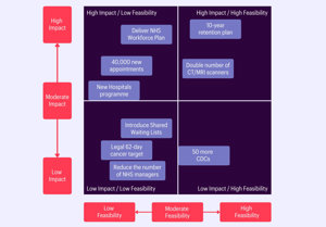 The nine policies captured a range of subjects which could impact the work of our specialities and the wider NHS and included some policies on which there is cross party agreement. The response of our insight panel shows that while there are some policies which respondents feel are feasible, there is a general sense that many of the policies are not. There was also quite a range of opinions on the potential impact of these policies, which can be generally categorised using the matrix above compared with their perceived feasibility to be implemented.