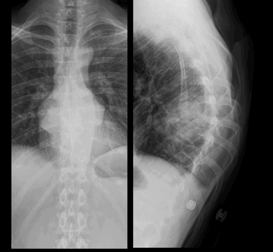 -Paravertebral soft tissue densities projected in the retrocardiac region bilaterally. This corresponds with density projected over vertebral bodies on the lateral projection Imp: Paravertebral masses - likely neurogenic e.g. Neurofibroma, schwannoma MRI Thorax is advised. |