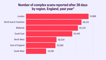 The areas which have a higher number of scans reported after 28 days are broadly reflective of larger population sizes, meaning greater demand for services. The South West, East of England and North West have smaller population sizes hence a lower number of scans reported after 28 days.