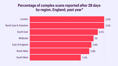 The percentage of scans going unreported within four weeks is similar across all regions. London has the highest proportion at 3.5% of scans and the South West has the lowest proportion with 2.4% of scans going unreported within four weeks.